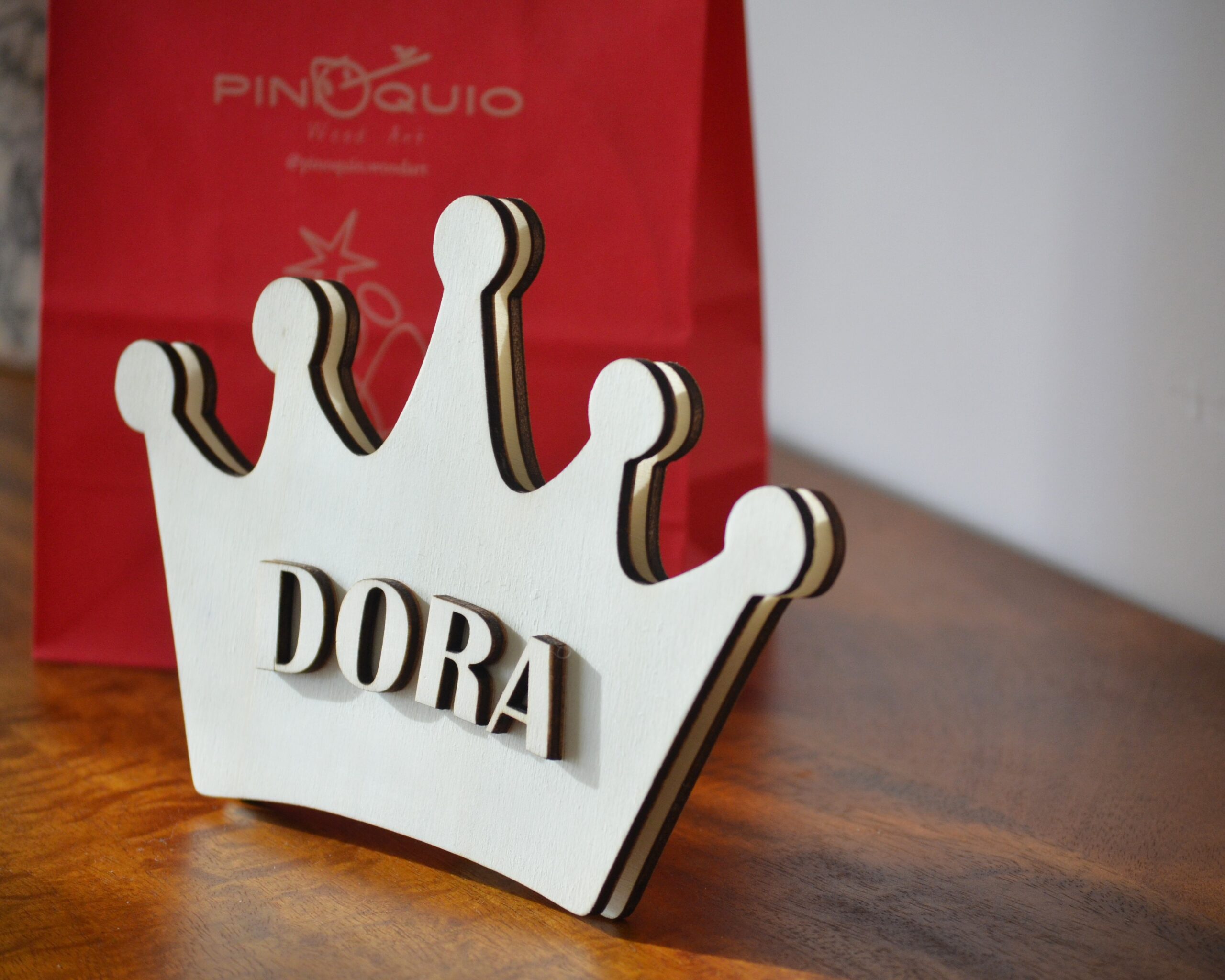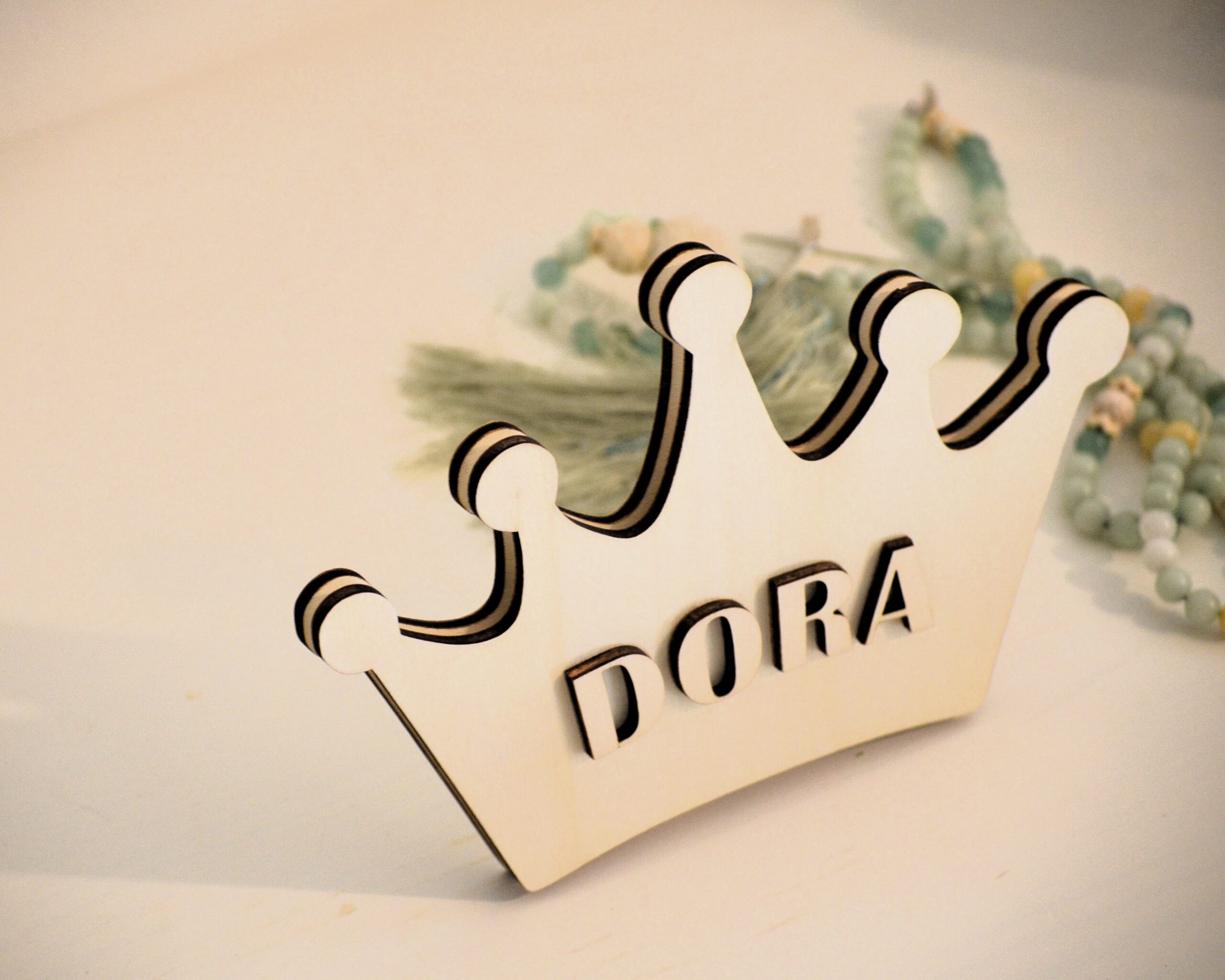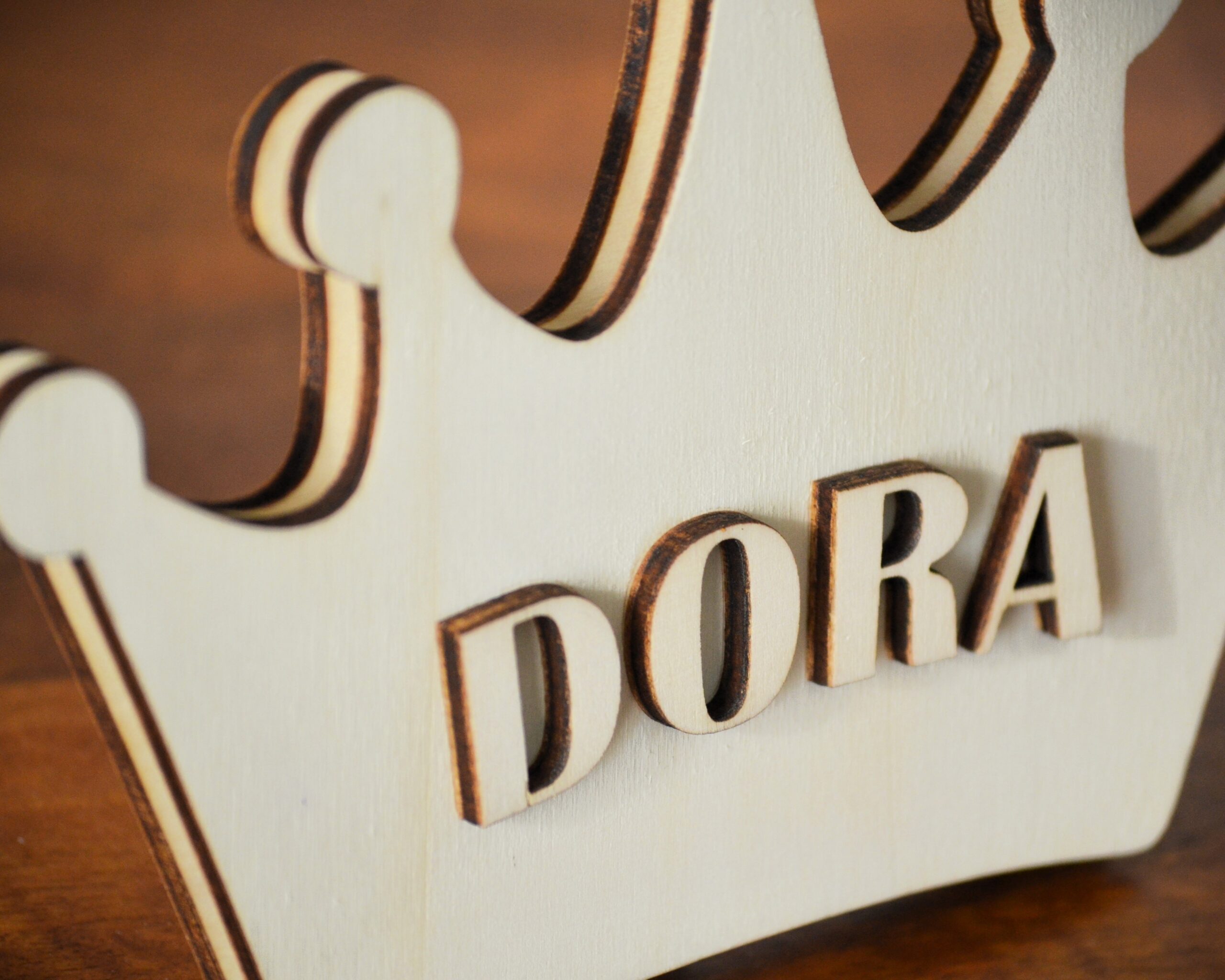 Coroa em dupla camada cortada a Laser em madeira e o nome da Dora em relevo para  criar algo bem tridimensional e único.