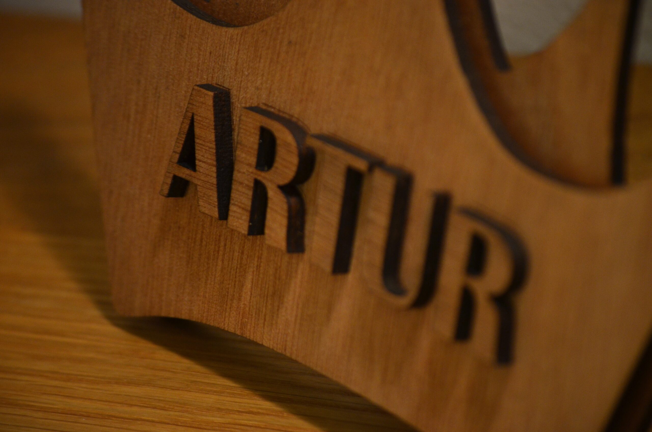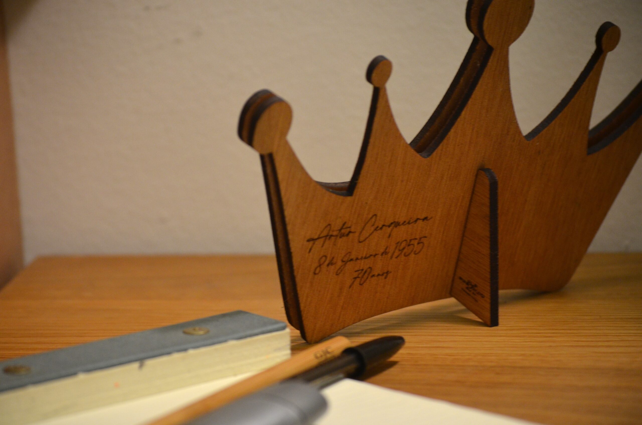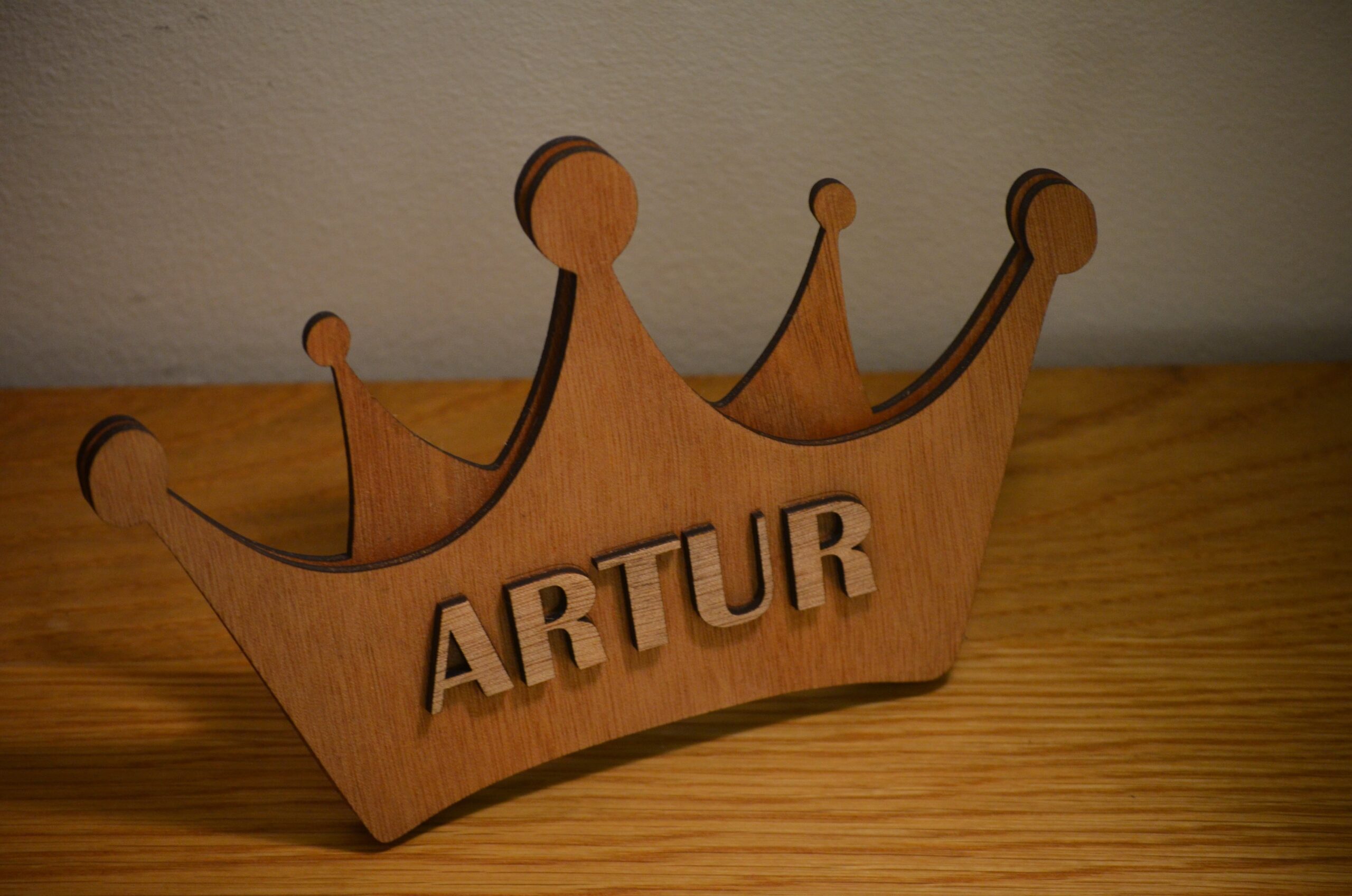 Coroa em dupla camada cortada a Laser em madeira e o nome do ARTUR em relevo para criar algo bem tridimensional e único.