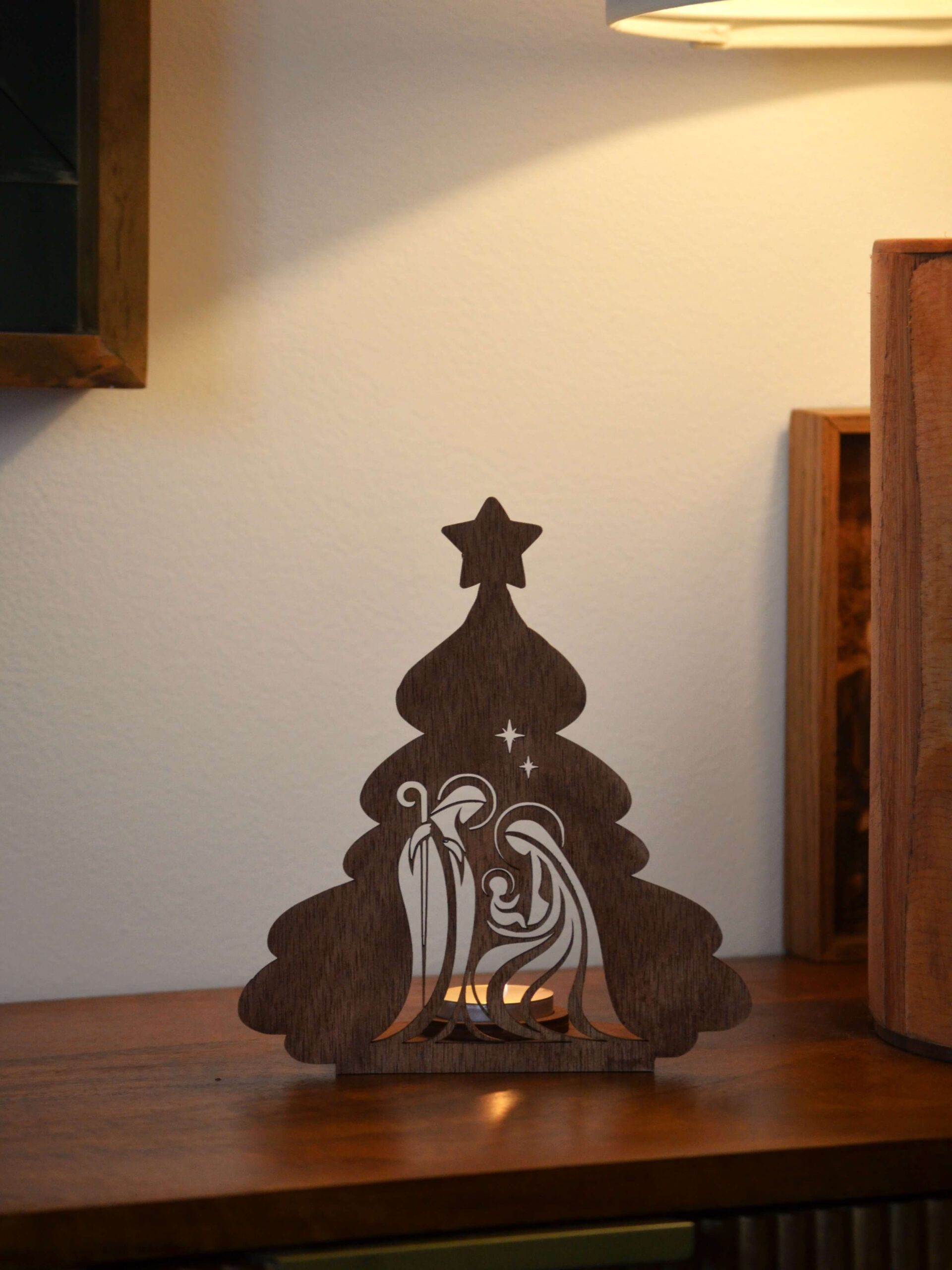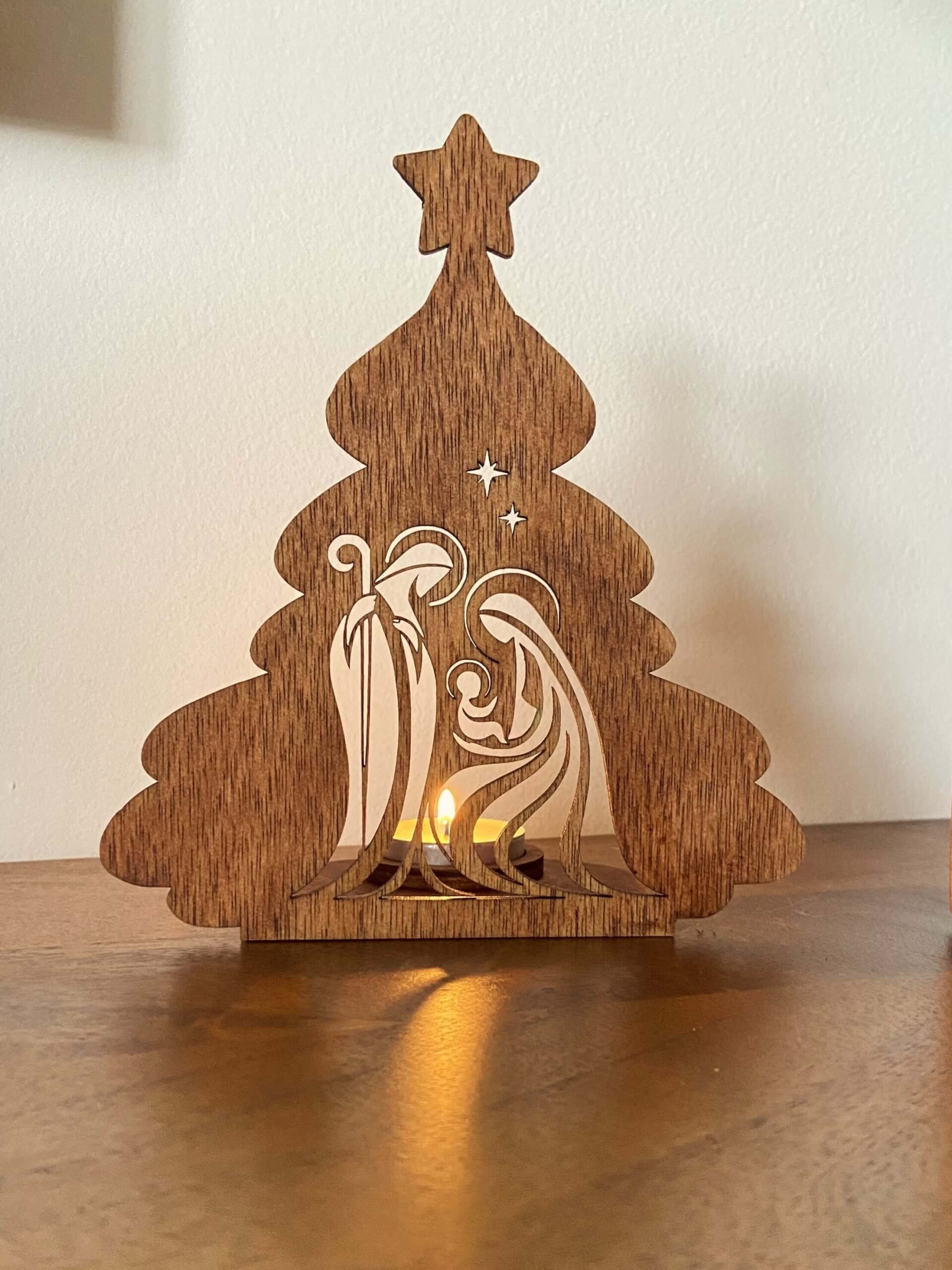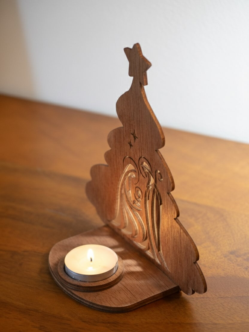 Este porta-velas em madeira de corte a laser apresenta o Presépio Sagrado, permitindo que a luz da vela  crie um brilho quente e mágico.