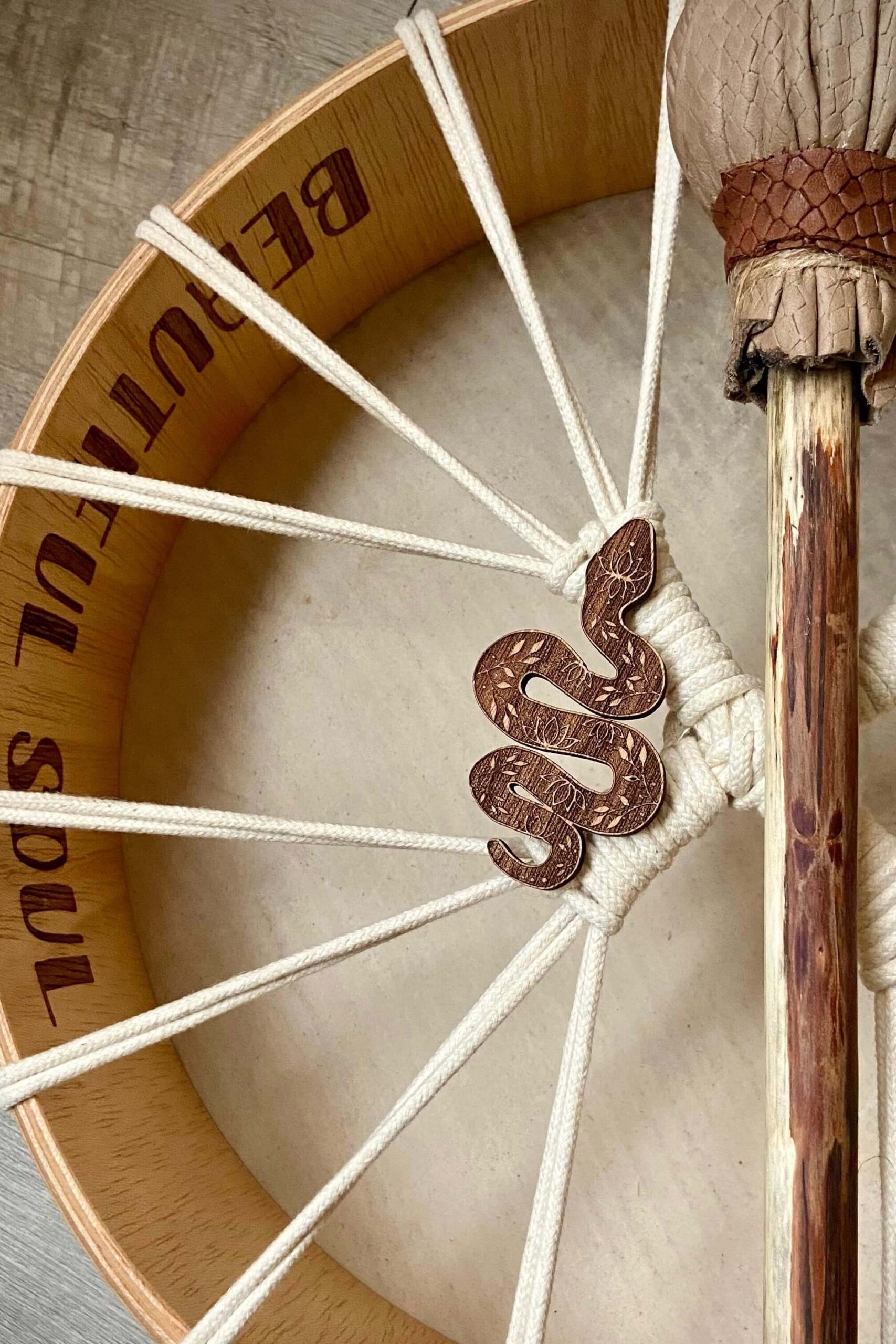O aro de madeira é personalizável com uma mensagem especial (como exemplo “Brave Heart, Free Spirit, Beautiful Soul”), tornando este instrumento numa peça verdadeiramente sua ou um presente com significado. Inclui uma baqueta para que possa começar a tocar de imediato. Um instrumento de poder para a sua jornada espiritual.